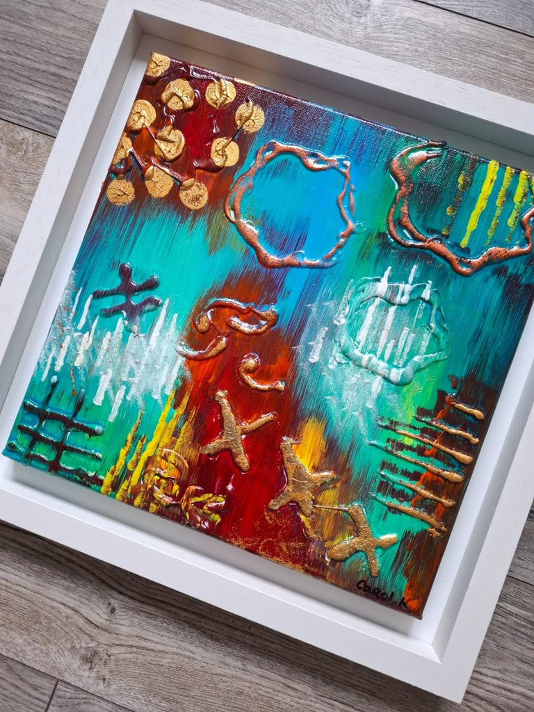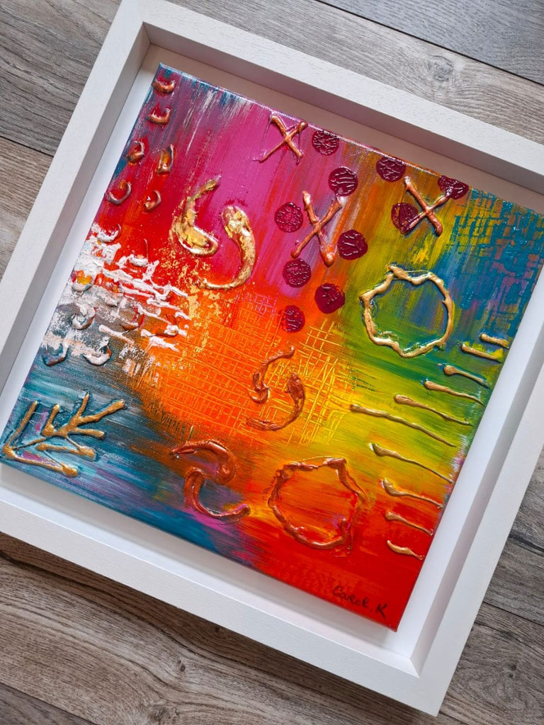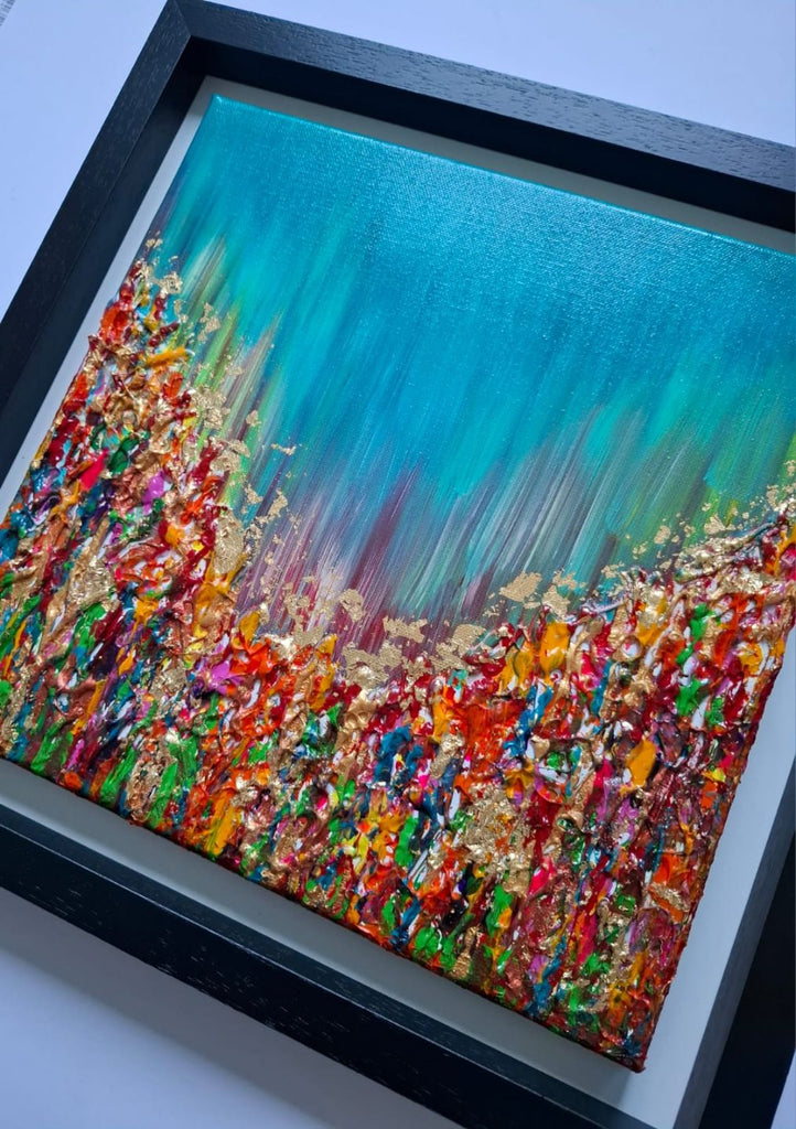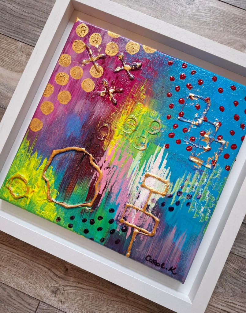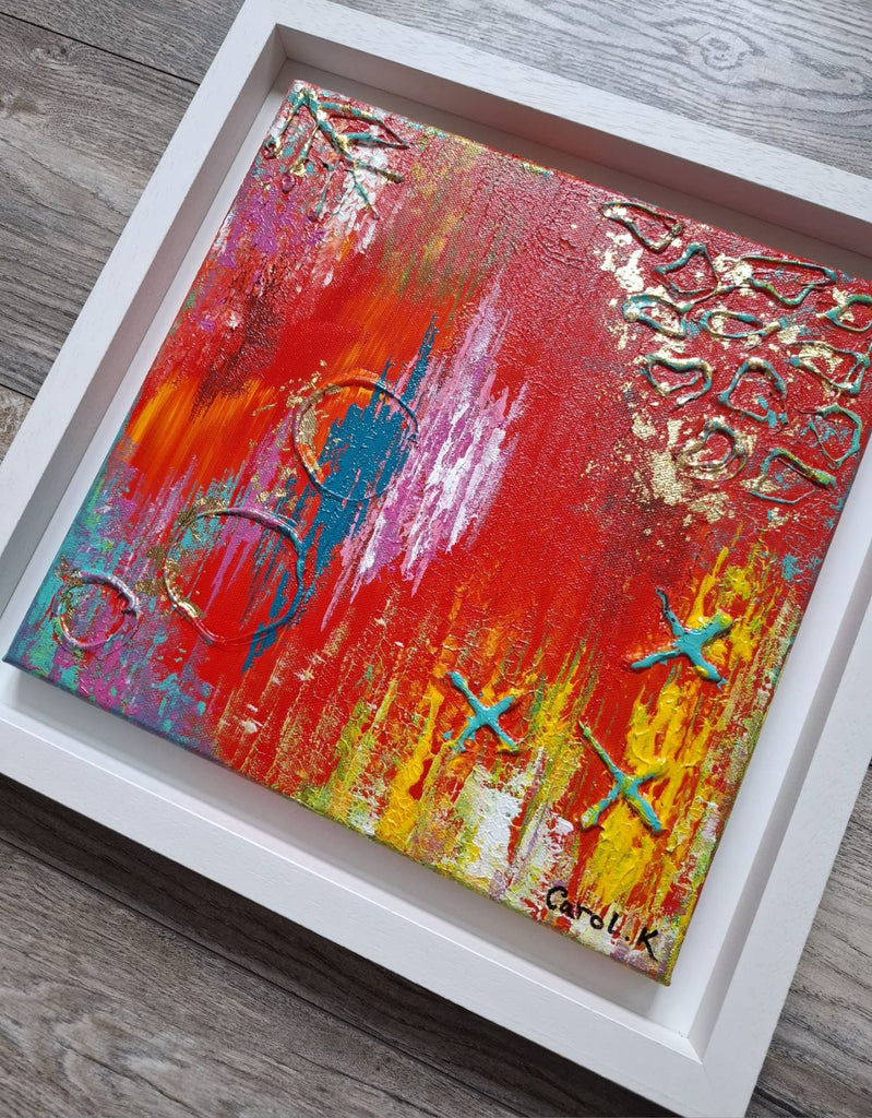 Discover Carol Kelly’s collection of original textured abstract paintings — each one a unique expression of colour, depth, and emotion. Handcrafted on canvas and finished with gold leaf and clear varnish, these vibrant works bring light and movement to any space. Every piece is beautifully framed in a wooden floater frame, ready to hang and transform your home or workspace with creativity and character.