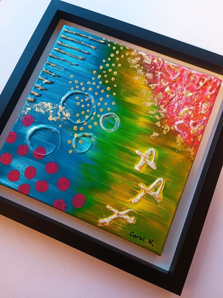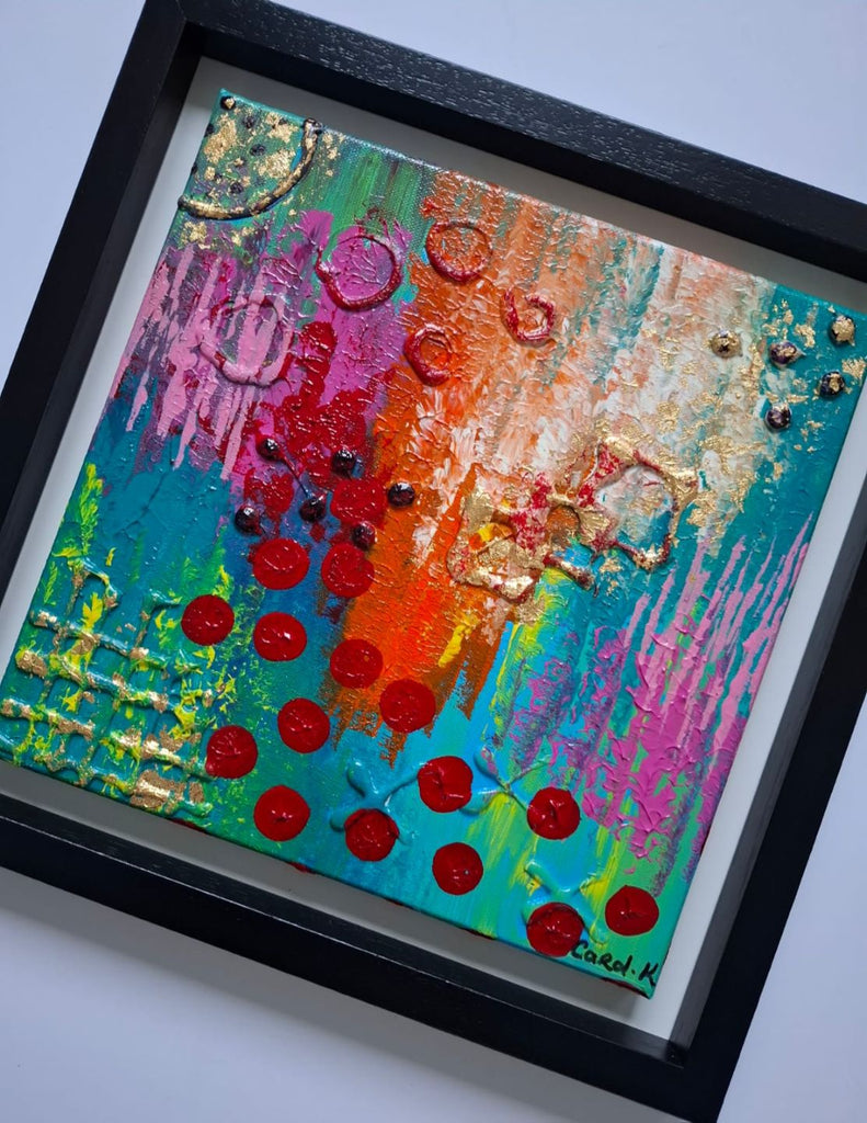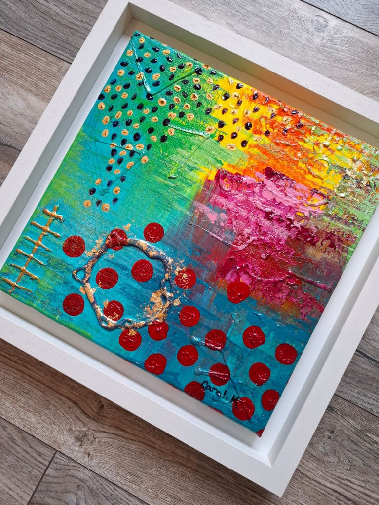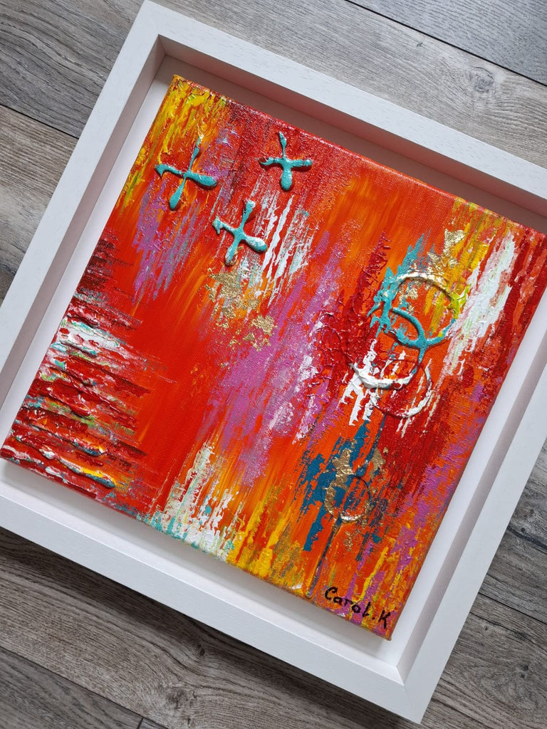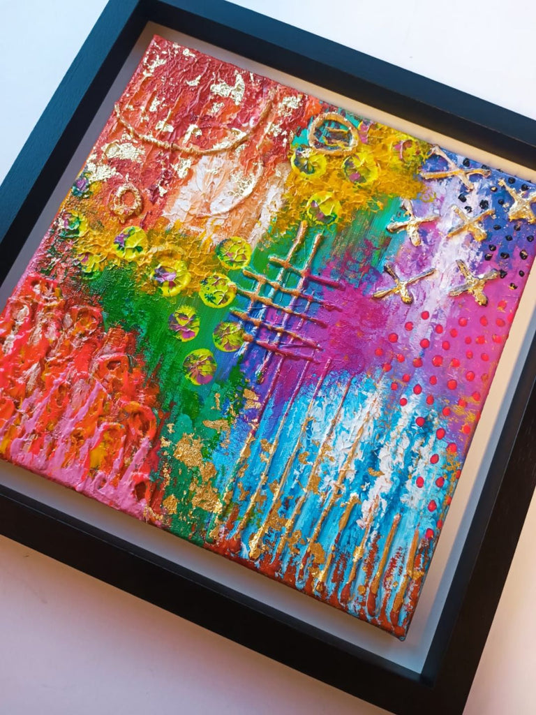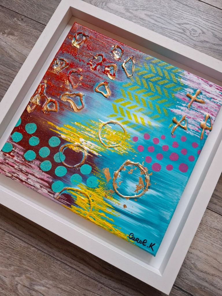 Discover Carol Kelly’s collection of original textured abstract paintings — each one a unique expression of colour, depth, and emotion. Handcrafted on canvas and finished with gold leaf and clear varnish, these vibrant works bring light and movement to any space. Every piece is beautifully framed in a wooden floater frame, ready to hang and transform your home or workspace with creativity and character.