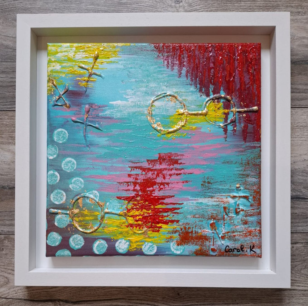 Original Textured Abstract Painting on canvas and framed in white wooden floater frame.