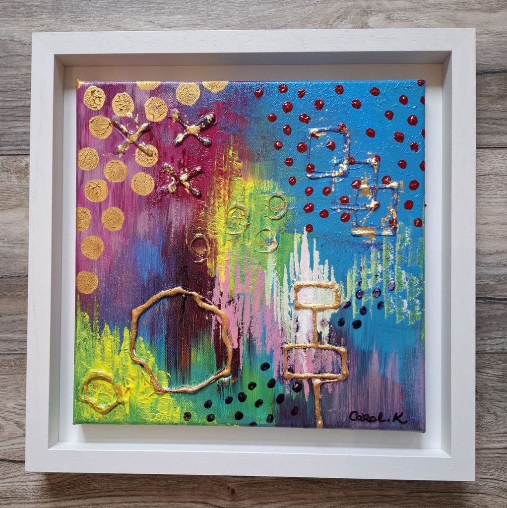 Original Textured Abstract Painting on canvas and framed in white wooden floater frames.