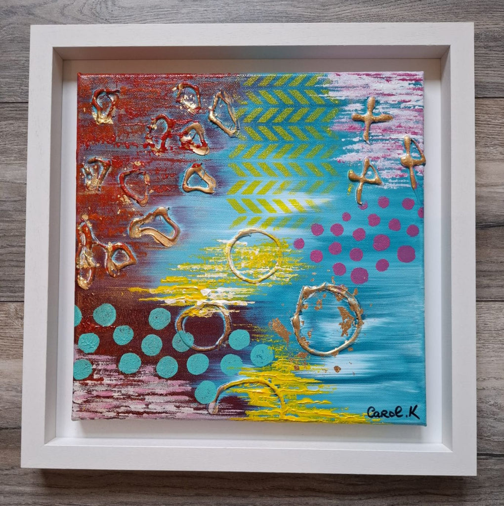 Original Textured Abstract Painting on canvas and framed in white wooden floater frame.