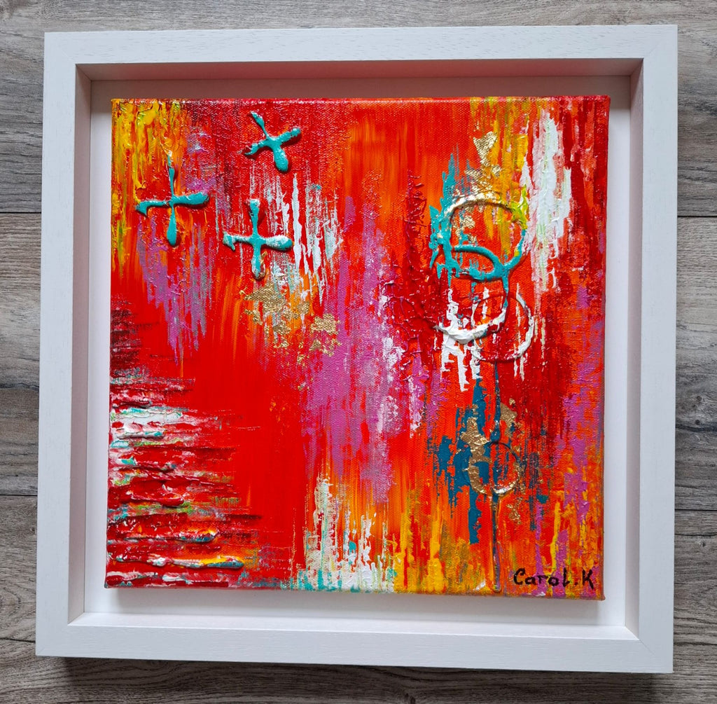 Original Textured Abstract Painting on canvas and framed in white wooden floater frame.